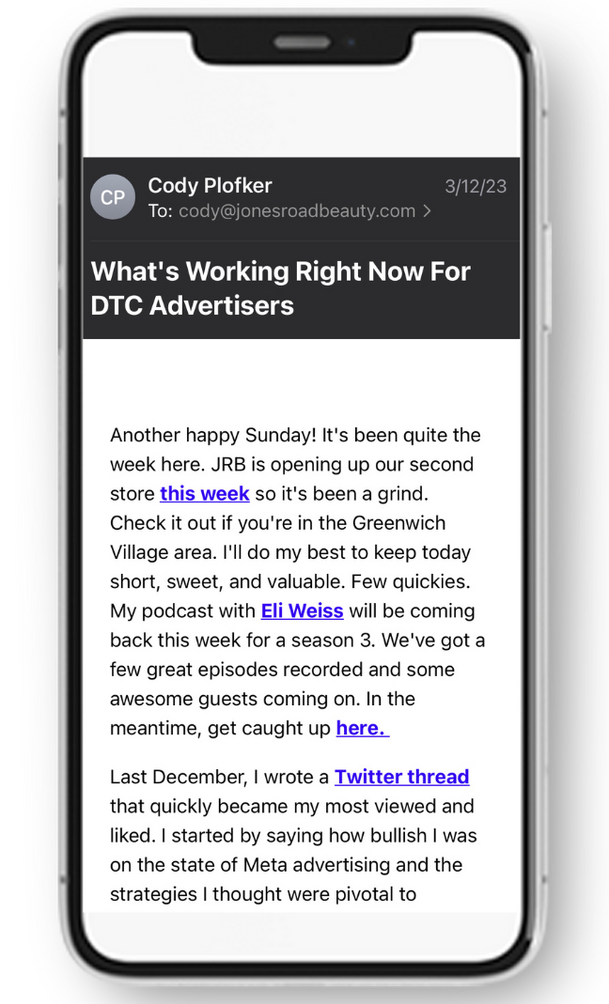Join 20K+ DTC marketers from brands like Hexclad, Prose and Allbirds and sign up for the weekly newsletter from Cody Plofker, a 9-Figure DTC CMO. Includes tactical tips on Facebook Ads, DTC growth and eCommerce.
